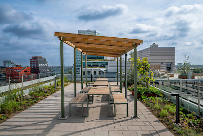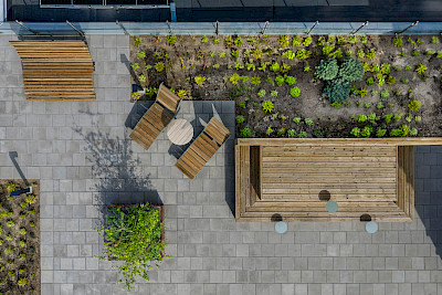 Gemeinschaftlich genutzte Bereiche wurden mit dem Långbordet sowie runden Tischen und Sitzgruppen aus der Parco-Serie ausgestattet, um Austausch und Gespräche zu fördern. Kajen-Sonnenliegen und der High Sunchair kamen dort zum Einsatz, wo Rückzug und Erholung im Vordergrund stehen. Unter Akalla-Pergolen entstanden Zonen für Arbeiten und Besprechungen im Freien. Deli-Anstelltische in Kombination mit fest installierten Bänken verleihen den Terrassen eine Anmutung, die an ein urbanes Straßencafé erinnert. Elbin-Abfallbehälter sind auf allen Terrassen vorhanden.
