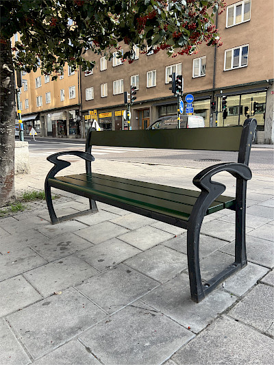Klara är utförd i klassiskt material, gjutjärn och furu. Soffan är förberedd för fastsättning i mark. Längden på soffan är endast 160cm, vilket gör den lätt att placera i de flesta miljöer