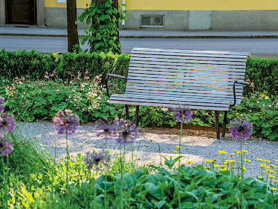 Klassisk och modern parkbänk av hög kvalitet, med eleganta konturer och med sits av träribb.