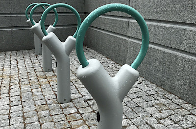 Cykelpollare i återvunnen aluminium och bockat stålrör.