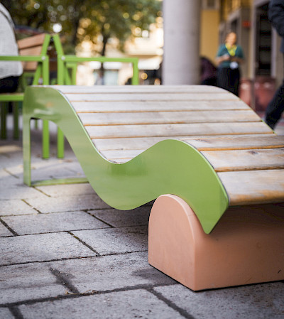 Stomme i elförzinkad och pulverlackerat stål i RAL 6025, glans 70. Ribbor i Linaximpregnerad furu alternativt SIOO:X behandlad eller oljad ek.