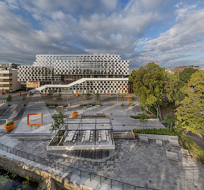 Bilden visar bland annat Terrass pergola, Parco möbelgrupp och Kajen solsoffa på gården av Mälardalens Universitet.